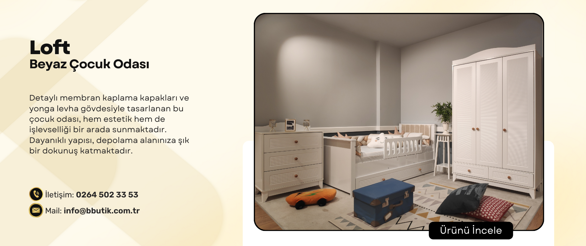 Modern ve güçlü tasarımlarla çocuk odalarını yenileyin. Mobilya modasının trend renkleri ve güçlü tasarımlarıyla yaşam alanınıza kimlik kazandırın. Kişiliğinizi yansıtan yeni sezon modüler tasarımlar, işlevsel mobilyalar ve ön plana çıkan koleksiyonlarla mobilya modası şimdi Bbutik'te. Yeni sezon çocuk odası takımları, yeni koleksiyonlarla şimdi daha şık ve estetik dokunuşlara sahip.